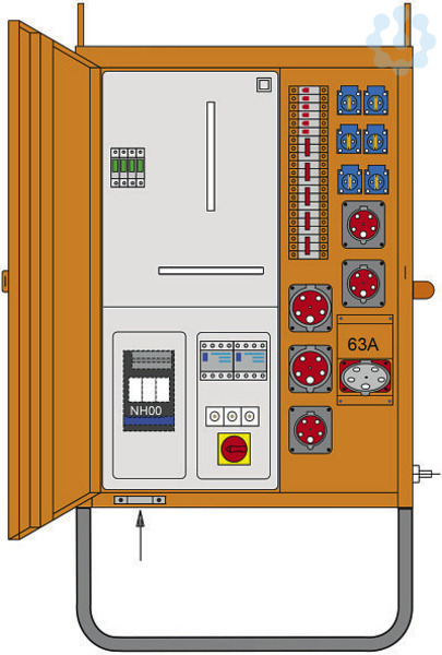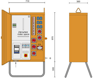 Versorgungsgebiet: Wien; Baustromverteiler 63A nach ÖVE EN 61439/4; RAL 2000 / 70kg / 710x1270x360mm (BxHxT) m. Untergest. 300mm; incl. Überspannungsableiter 3+1 (TT+TN) Kl."C" (25A - 125A); Anschlusssicherung: NH-Trenner Gr.00 80A, mittels Schloss ET08-EHSK absperrbar; Anschlussquerschnitt: max. 35mm² Cu; Zählerplatz: Wirkstromzählerschleife H07V-K 16mm2 400V AC; Haupsicherung: Lasttrennschalter mit Sicherung DIII 63A; 1xCEE-Steckdose 63A 5p 400V keine Strompfadsicherung; 2xCEE-Steckdose 32A 5p 400V abgesichert ü. 2xLS 32A 3p C; 3xCEE-Steckdose 16A 5p 400V abgesichert ü. 3xLS 16A 3p C; 6xSK-Steckdose 16A 250V IP54 abgesichert ü. 6xLS 16A 1p C; 1xFI 100A/4/0.3A Umrichterfester FI für CEE-Steckdose 63A 5p 400V; 1xFI 63A/4/0.03A therm. fest für die restlichen Steckdosen