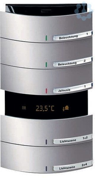 Mit integriertem KNX-Busankoppler. Mit Beschriftungsfeld. Tasterfunktion (Schalten/Dimmen/Jalousie/Wert senden/Lichtszenen/Lüftungsfunktion) Master-/Slavebetrieb. Mit Grundlastbetrieb. Bedienelement mit Raumtemperaturreglerfunktion zur Ansteuerung von Heizungs-, Lüftungs- und Fan Coil Aktoren. Der Regler ist ein stetiger Raumtemperaturregler für Ventilator-Konvektoren (Fan Coil) in 2- und 4-Rohr Anlagen und konventionellen Heiz- oder Kühlanlagen Die Lüfterstufe kann manuell oder in den Automatikbetrieb geschaltet werden Zur Ansteuerung durch Busch-Ferncontrol® IR-Handsender 6010-25 bzw. 6020-.../6021... . Klasse des Temperaturreglers: 1 Beitrag zur Raumheizungsenergieeffizienz: 1,0%. Bei Bedarf entnehmen Sie bitte die programmierbaren Funktionen aus der aktuellen Applikationsbeschreibung die Sie von unserer Internetseite www.busch-jaeger.de herunterladen können. Passende Beschriftungssoftware unter www.BUSCH-JAEGER-Beschriftungstool.de.