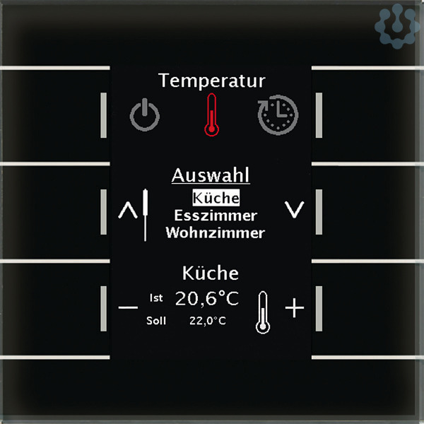 KNX Glas Bedienzentrale Smart mit Farbdisplay, Schwarz. Ausführung mit 6 Sensorflächen. Integrierter Busankoppler. Großes, aktives Farbdisplay (automatische Helligkeitsanpassung). Vier Direktbedienfunktionen (z. B. Anwesend, Licht, Jalousie). 20 Bedienfunktionen über Menü/Schaltuhr (z.B. Dimmen/Jalousie/Schalten/Werte senden/Szenen/Temperatursollwerte). Codeschloss mit 4-6 Ziffern zur Gerätesperrung oder Alarm-Scharfschaltung.Tages-/Wochen-/Astro-Zeitschaltuhr (20 Kanäle mit je 6 Schaltzeiten). Urlaubsfunktion mit Zeitraumaktivierung. Automatische Feiertagsberechnung. Komfortabler Raumtemperaturregler mit Temperatursensor. Lüftungssteuerung (Hand oder Automatik). Anzeige von Innen-/Außentemperatur, Sollwert und Uhrzeit/Datum. Anzeige von Statusinformationen / Meldungen(1Bit)/(14Byte). 6 Status LEDs unabhängig ansteuerbar. 6 Logikblöcke mit je 4 Eingängen. Keine zusätzliche Spannungsversorgung erforderlich. Einbau in Schalterdose, Abmessungen (B x H): 92 mm x 92 mm. Empfohlene Montagehöhe 1,6 m. 3 Jahre Produktgarantie.