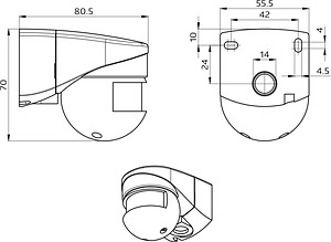 Mini-Außenbewegungsmelder mit einem Erfassungsbereich von 180 Grad, Beweglicher Kugelkopf, Erfassungsbereich kann durch Abdecklamellen eingeschränkt werden