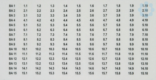 2x 165 Klebeetiketten zum Kennzeichnen der Busadresse für Überwachungsgeräte DRC MCM XT (BA1 bis BA15) und der laufenden Nummer für die zugeordneten BXT-Basisteile oder -Module, (1.1-1.10 bis 15.1-15.10).