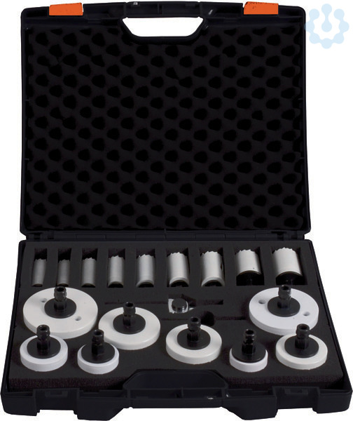 BiMetall Lochsaegen-Koffer "Universal" 18 tlg. 17 an der Lochsaege vormontierte Verbindungsstücke, inkl. 1 x Schnellwechsel-Adapter
