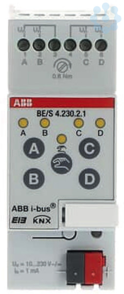 Das Gerät erfasst vier AC/DC-Signale im Spannungsbereich von 10...230 V. Der Eingangszustand wird über 4 gelbe LED’s angezeigt. Die Binäreingänge ermöglichen die Erfassung von insgesamt 4 Eingangssignalen (in 2 Gruppen). Pro Kanal verfügen die Geräte über eine Taste zur Handbedienung. Die Geräte werden über den ABB i-bus® versorgt und benötigen keine zusätzliche Stromversorgung.