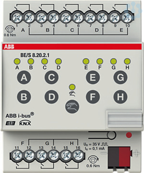 Das Gerät fragt 8 potenzialfreie Kontakte mit intern erzeugter Abfragespannung ab. Der Eingangszustand wird über 8 gelbe LED’s angezeigt. Die Binäreingänge ermöglichen die Erfassung von 8 von einander unabhängigen Eingangssignalen. Pro Kanal verfügen die Geräte über eine Taste zur Handbedienung. Die Geräte werden über den ABB i-bus® versorgt und benötigen keine zusätzliche Stromversorgung.