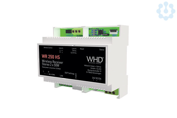 Der WR 250 DSP HS ist ein Bluetooth-/(W)LAN-Receiver mit 2x50W Stereo-Verstärker und DSP (Digitaler Signal Prozessor) für die Montage im Verteilerschrank auf der Hutschiene. Für den DSP-Chip wurde ein eigener Algorithmus entwickelt, der im Lautsprecher eine dynamische Klanganpassung vornimmt. Diese Technologie, das WHD Adaptive Sound Plus, sorgt unter anderem dafür, dass der Hörer auch bei leiser Lautstärke eine hochwertige Klangqualität erlebt. Es können 3 Presets ausgewählt werden: Neutral, Loudness, Extra Baß. Am Line-In kann eine externe Tonquelle angeschlossen werden. Der WR 250 DSP HS kann über die Ethernetbuchse oder per WLAN und auch per Bluetooth betrieben werden. Der WR 250 DSP HS hat – wie alle unsere WLAN-Receiver – bereits ein Internetradio an Bord. Das hat den großen Vorteil, dass über den WR 250 DSP HS auch ohne Smartphone/Tablet Internetradio gehört werden kann. Wenn der WR 250 DSP HS keinen internen Internetradiosender spielt, dann empfängt er die Musik z.B. von einem Smartphone oder Tablet über die WHD-Multiplayer-App oder über beliebige Musik-Apps per AirPlay*, DLNA oder UPnP und gibt sie über die angeschlossenen Lautsprecher wieder. Wie alle WHD WLAN-Receiver und Lautsprecher ist auch der WR 250 DSP HS kompatibel mit spotify connect. Ein optional erhältliches KNX-Gateway kann alle (W)LAN-Geräte von WHD – also auch den WR 55, WR 205, den Qube (XL) und den AirBridge – ansteuern. Man kann z.B. via KNX eine Internetradiostation auswählen, die direkt vom WLAN-Modul abgespielt wird. Dafür ist kein Smartphone oder Tablet erforderlich. Weiterhin kann via KNX die Lautstärke geregelt und das Modul ausgeschaltet werden.
