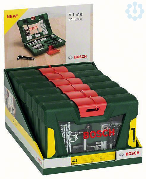 V-Line Box. 41-teilig. 6 x 41-teiliges V-Line Bohrer- und Bit-Set. Inhalt eines Sets: Winkelschrauber. 7 HSS-R Metallbohrer mit Durchmesser von 2 bis 6 mm. 6 Steinbohrer mit Durchmesser von 5 bis 8 mm. 5 Holzbohrer mit Durchmesser von 3 bis 8 mm. 2 Flachfräsbohrer mit Durchmesser von 16 und 20 mm. 11 Schrauberbits mit Länge: 25 mm, PH 1 / 2, PZ 1 / 2, S 4 / 5 / 6, T 20, H 4 / 5 / 6. 6 Steckschlüssel mit Durchmesser 6 / 8 / 9 / 10 / 11 / 13 mm. Kegelsenker und magnetischer Bithalter.