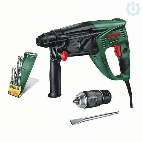 Bohrhammer PBH 3000 FRE, Höchste Leistungskraft und Vielseitigkeit für die schwierigsten Arbeiten, 750-W-Motor und pneumatisches Hammerwerk mit 2,8 Joule für die schwierigsten Anwendungen, Überlastkupplung für Anwender- und Werkzeugschutz, Hämmern und Meißeln in Beton und Mauerwerk; Bohren in Fliesen, Holz und Metall, Meißelfunktion mit Vario Lock für zahlreiche Meißelpositionen zur Auswahl, Geringes Gewicht von nur 3,3 kg; Bohren von Durchmessern bis zu 26/30/13 mm in Beton/Holz/Metall, Bosch SDS Adapterbohrfutter (1 618 571 033), Flachmeißel (2 609 255 570), Tiefenanschlag (2 603 001 019), Zusatzhandgriff (2 602 025 102), 4-teiliges Bohrer-Set: SDS-Drill 5/6/8/10 mm, Tragekoffer
