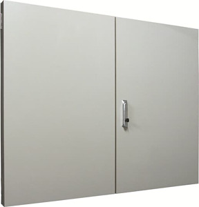Brandschutz-Vorsatztür, Baureihe VF, für den Innenbereich, mit Blendrahmen und Tür, Schutzart IP54, Baustoff nach A2 - nicht brennbar, geprüft nach DIN 4102-1, rauchdicht, Feuerwiderstand 30 min geprüft nach DIN 4102-2, Brandlastdämmung 30 min in Anlehnung an DIN 4102-11, Funktionserhalt 30 min in Anlehnung an DIN 4102-12, oberflächenbeschichtet, in RAL AEHNLICH7035, Doppeltür, Tür aus nicht brennbarem Material, mit Schwenkhebel mit Halbzylinder, Türöffnungswinkel 180 Grad, Türanschlag rechts und links, Abmessungen in mm (H x B x T): 1345 x 1295 x 51, Blendrahmenmaße in mm (H x B x T): 1345 x 1295 x 22, Rasteinheit 7 RE, Bauhöhe 3, Feldbreite 4, Platzeinheiten 336