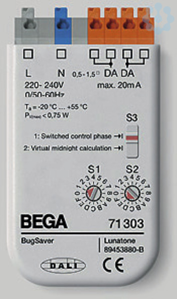BEGA Steuergerät 71303 für den Einbau in Schalter- und Hohlraumdosen oder in Leuchten der Schutzklasse I. Steuergerät für BEGA BugSaver®-Aufsatzleuchten zur Umschaltung der Farbtemperatur von 3000 K auf 1800 K zum Schutz nachtaktiver Insekten. Zudem kann eine Leistungsreduzierung vorgenommen werden. Die Umschaltung erfolgt wahlweise durch eine geschaltete Steuerphase oder durch virtuelle Mitternachtsberechnung. Stromversorgung über DALI-Bus für bis zu 9 Standard DALI-Lasten. Betriebsart 1: Leistungsreduzierung durch geschaltete Steuerphase. Betriebsart 2: Leistungsreduzierung mithilfe von virtueller Mitternachtsberechnung. Einstellungen über Dreh- und Schiebeschalter. Anschlussklemmen 0,5-1,5 qmm in doppelter Ausführung zum Durchverdrahten der DALI-Busverbindung.