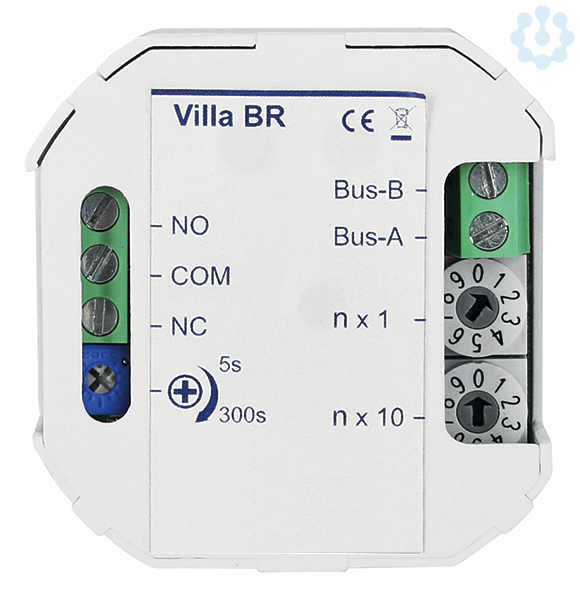 Multifunktions-Busrelais Ausgang für das Villa 2-Draht System, einstellbar per Adressierung entweder zur Ansteuerung durch Klingeltasten (z.B. für externe Läutwerke) oder zur Ansteuerung durch die Türöffnertaste oder Funktionstaste am Monitor (z.B. für Licht an), potentialfreier Ausgangs-Kontakt, Belastbarkeit 30 V DC / 12 V AC, 1 A, Zeitverzögerung: 5-300 Sek., Abmessungen: 49x51x22 mm, Schutzart IP 20