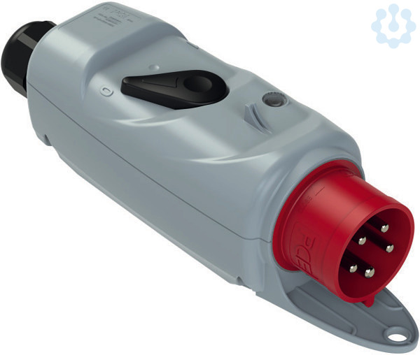 CEE-Stecker mit Schalter (EIN-AUS) +BA 32A 5p 6h IP44 mit Bügel; Gehäusematerial: PC/ABS; Nennstrom: 32A; Polzahl: 5 (3P+N+PE); Uhrzeit-Stellung: 6h; Nennspannung/Frequenz: 200/346V~ - 240/415V~ / 50+60Hz; Kontakte: Messing vernickelt; Anschlusstechnik: Schraubklemmen; Drehknebelschalter (AC22A 10kA) EIN/AUS, mit Betriebsanzeige; Kabelverschraubung: M32; mit Bügellasche; Schutzart: IP44