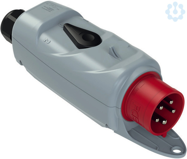 CEE-Stecker mit Schalter (WENDE) 32A 5p 6h IP44 mit Bügel; Gehäusematerial: PC/ABS; Nennstrom: 32A; Polzahl: 5 (3P+N+PE); Uhrzeit-Stellung: 6h; Nennspannung/Frequenz: 200/346V~ - 240/415V~ / 50+60Hz; Kontakte: Messing vernickelt; Anschlusstechnik: Schraubklemmen; Drehknebelwendeschalter (AC22A 10kA) (I-0-I), ohne Anzeige; Kabelverschraubung: M32; mit Bügellasche; Schutzart: IP44