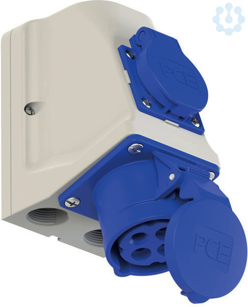 CEE-Wandsteckdose + SSD COMBO 16A 4p 9h IP44; Gehäusematerial: PA6; Nennstrom: 16A; Polzahl: 4 (3P+PE); Uhrzeit-Stellung: 9h; Nennspannung/Frequenz: 200-250V~ / 50+60Hz; Kontakte: Messing; Anschlusstechnik: Schraubklemmen; Leitungseinführung: oben, 2x unten oder hinten; mit Schutzkontaktsteckdose (franz./belg. System) - fertig verdrahtet; Schutzart: IP44