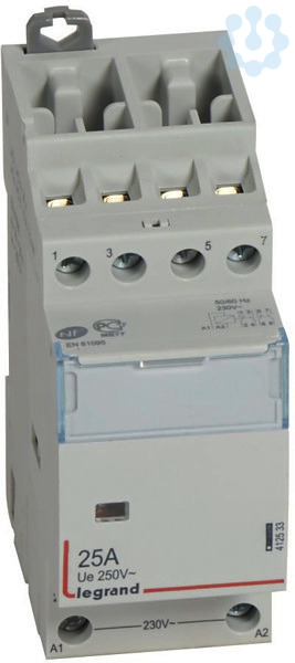 Legrand Installationsschütz CX3, Spulenspannung AC 230 V, 4-polig, Ausführung: 2 Schließer + 2 Öffner, Bemessungsbetriebsstrom Ie 25 A/ 400 VAC, ohne Handschalter. Nach EN 61095, Gebrauchskategorie AC-1/AC-7a und AC-3/AC-7b, Installationsschütze zum Schalten von Lasten wie z.B. Lampengruppen, Motoren und Heizungen, mit Beschriftungsfenster, mit Schaltzustandsanzeige, Befestigung auf Hutprofilschiene EN 60715 durch rastende Schnellbefestigung, Anbau von Hilfsschaltern möglich.