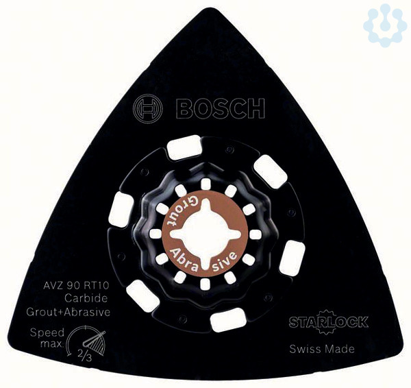 Carbide-RIFF Schleifteller AVZ 90 RT10. Carbide Sanding, Grit 10. Carbide-RIFF mit Körnung 100. Der Schleifteller Starlock AVZ 90 RT10 Carbide-RIFF bietet besonders hohe Lebensdauer beim Entfernen von Mörtel und Fliesenkleber. Der Teller ist für hohe Verschleißfestigkeit und somit außergewöhnlich lange Nutzungsdauer mit hochwertigem Hartmetallkorn der Körnung 100 besetzt. Der offene Besatz ermöglicht aggressiven Materialabtrag ohne Zusetzen oder Ablagerung für eine höhere Lebensdauer des Tellers. Mit dem deltaförmigen Teller lassen sich schwer zugängliche Ecken erreichen. Dieser Schleifteller ist ideal für alle Schleif- und Raspelarbeiten auf Holzmaterialien aller Art geeignet. Es ist kompatibel mit allen Elektrowerkzeugen des Typs Starlock, Starlock Plus und Starlock Max sowie allen gängigen Multifunktionswerkzeugen. Das Aufnahmesystem ermöglicht durch seine dreidimensionale enge Passung maximale Kraftübertragung zwischen Maschine und Zubehör.