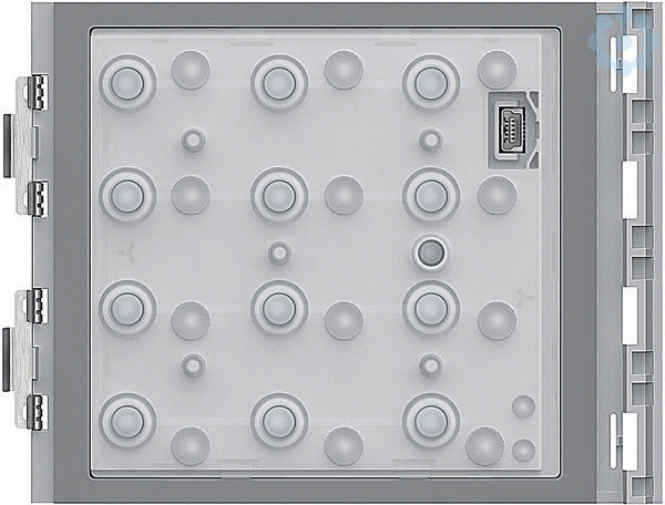 Codelock-/Tastatur-Modul. Das Codelock-/Tastatur-Modul kann für 2 Funktionen verwendet werden: – Als Codelock: Zur Aktivierung des Türöffnerrelais am Lautsprechermodul oder des Wechselkontakts (C-NO-NC) direkt am Codelockmodul. – Als Zusatztastatur: Bei direktem Anschluss an das Grafikdisplay Art. 352500 können die Teilnehmer über eine zugewiesene Rufnummer angerufen werden. Außerdem kann das Türöffnerrelais am Lautsprechermodul aktiviert werden. Verfügt über ein Kontaktrelais (C–NO–NC) und Klemmen (CP–P1–P2) zum Anschluss einer externen Türöffnertaste. Die Programmierung des Moduls kann auf 2 Arten erfolgen: – Über die Tastatur (beachten Sie die Installationsanleitung) – Programmierung über den PC, wobei die Programmdateien ans Modul übertragen werden. Verfügt über eine Reset-Taste für das Programm und über Status-LED zur Anzeige des Zugangsstatus. Nächtliche LED-Hintergrundbeleuchtung. Mit einer Frontblende zu vervollständigen. Das Modul kann entweder mit Hilfe von Konfiguratoren oder über PC und Software TiSferaDesign konfiguriert werden. Anmerkung: Wenn das Codelock-/Tastatur-Modul mittels mitgeliefertem Flachbandkabel an einem Lautsprecher- oder Grafikmodul angeschlossen wird, ist der Wechselkontakt deaktiviert und der Türöffnerkontakt am Lautsprechermodul wird angesteuert. Das Modul kann auch mit einem autonomen BUS-Netzgerät im Stand-Alone-Betrieb betrieben werden. Bei Kombination mit Audio-Lautsprechermodul Basic Art. 351000 ist das Codelock nur im Stand-Alone-Modus verwendbar.