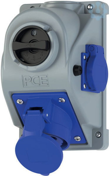 CEE-Wandsteckdose COMBO-POL 32A 3p 6h IP44; Gehäusematerial: PA6; Nennstrom: 32A; Polzahl: 3 (2P+PE); Uhrzeit-Stellung: 6h; Nennspannung/Frequenz: 200-250V~ / 50+60Hz; Kontakte: Messing vernickelt; Anschlusstechnik: Schraubklemmen; Leitungseinführung: oben oder hinten; mit EIN/AUS (0-I) Schalter AC22A; mit Schutzkontaktsteckdose 16A 250V (österr./deutsch. System); Schutzart: IP44