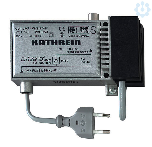 Compact-Verstaerker, 1 Eingang AM-FM BI u. BIII UHF, Verst. typ. AM -1,5, VHF-UHF 20 dB, Rauschm. typ. 7 dB, Fernspeisung ueber Ausg. moegl. typ. 15 V 100 mA