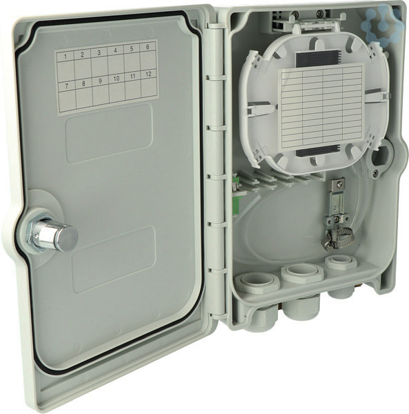 Kompakt Gebäudeverteiler, Gf-GV, 4 Fasern, CSS, 1 LC/APC QD, IP55 (AT29231). Spleißkassetten Anzahl: 1 | Faseranzahl: 4 | Kabel/Rohr Ausgang Anzahl: 2 | Kabel/Rohr Ausgang Ø: max. 12 × 2 mm