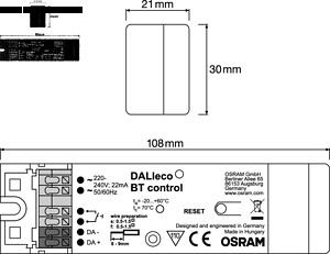 DALI-Steuergerät Bluetooth für Hohlraum-/Leuchteneinbau. Bluetooth Steuergerät für tageslicht- und präsenzabhängiges Regeln von bis zu 32 DALI-Teilnehmer DT6 und DT8, Anschluss bis zu 4 Sensoren und Tasterkoppler, diverse veränderbare Funktionsmodi, Konfiguration und Bedienung über iOS oder Android App Osram BT Control, Gehäuse für den Einbau in Hohlräume wie abgehängte Decken oder eventuell auch in Leuchtengehäusen vorgesehen.