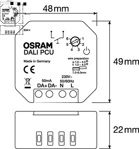 DALI Tastersteuergerät. Schalten und Dimmen von DALI DT6-Leuchten, Schalten, Dimmen und Farbveränderung bei DALI DT8-Leuchten, Einbau in Schalterdose 60mm tief, max. 25 DALI-Geräte anschließbar, bis zu 4 DALI PCU parallel betreibbar, Individuelle Einstellung der minimalen Helligkeitsstufe, Individuelle Einstellung des Farbtemperaturbereichs, Maße (L/B/H) 49x48x22mm.