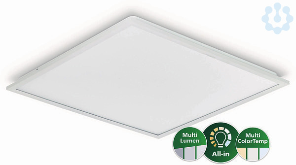 600x600 mm, Stahl, Weiß, Signalweiß (RAL9003), Netzteil (Ein/Aus), "All-in" Multi Lumen and Multi Color Temperature, 2900 lm, 3600 lm, 4300 lm, 34.5 W, 24.5 W, 120 lm/W, 3000 K, 3500 K, 4000 K, (0.38, 0.38) SDCM ≤3, UGR19, Abstrahlungswinkel (90°), Acrylat, 0,3 J, SchutzklasseII, Schnellsteckverbinder, 3-polig
