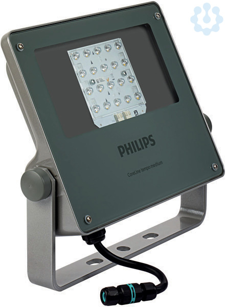 Floodlight, Aluminium, Grau, Netzteil (Ein/Aus), 8000 lm, 75 W, 135 lm/W, 3000 K, (0.434, 0.403) SDCM 5, CRI70, Asymmetrisch, Schutz gegen Eindringen von Staub, strahlwassergeschützt, 5 J vandalismusgeschützt, SchutzklasseI, Leuchtenüberspannungsschutz bis 6kV im Gegentaktmodus und bis 8kV im Gleichtaktmodus, Kabel (1,0m) mit Wieland-/Adels-kompatiblem Steckverbinder, 3-polig, Externer Anschluss