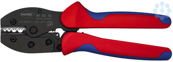 97 52 33 KNIPEX PreciForce® Gleichbleibend hohe Crimpqualität durch Präzisionseinsätze und Zwangssperre (entriegelbar). Crimpdruck ist werkseitig präzise eingestellt (kalibriert). Kraftverstärkung durch Kniehebel für ermüdungsarmes Arbeiten. Gutes Handling durch günstige Griffstellung, geringes Gewicht, kurze Bauform und ergonomisch geformte Griffe. - Anwendung: unisolierte Quetsch-, Rohr- und Presskabelschuhe nach DIN 46234 und DIN 46235 sowie unisolierte Quetsch-, Stoß- und Pressverbinder nach DIN 46341 und DIN 46267 - Kapazität Quadratmillimeter: 0,5 — 10,0mm² - Anzahl der Nester: 4 - AWG: 20 — 8