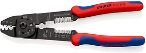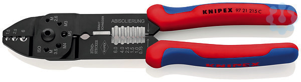 97 21 215 C Crimpzange Zum Kabelschneiden, Abisolieren von Drähten und Crimpen von isolierten und unisolierten Kabelschuhen und Steckverbindern und offenen Steckverbindern. Mit Gewindelöchern zum Abschneiden von Cu- oder Ms-Gewindestiften mit M 2,6; M 3; M 3,5; M 4 und M 5. Geschraubtes Gelenk für eine hohe Stabilität und gleichmäßigen Lauf. - Anwendung: unisolierte Kabelschuhe + Kabelverbinder - Kapazität Quadratmillimeter: 0,5 — 6,0mm² - Anzahl der Nester: 3 - AWG: 20 — 10