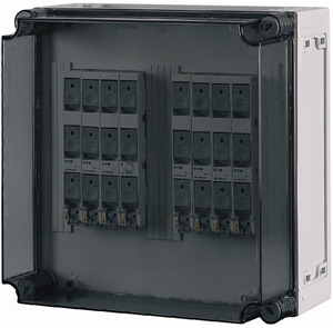 D02-Verteilergehäuse mit transparentem Deckel, 8x D02-Lasttrennschalter auf Sammelschienen-System 400A, 3-polig, Träger inklusive für N+PE zum Nachrüsten, mit CU-Schienen L1/L2/L3: 20 x 10 mm, N: ohne, PE: ohne, ohne Klemmen, Sicherungsgerät mit Schubladen und Blinkfunktion, ohne Sicherungen.