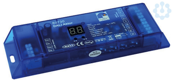 4 Adressen - 4 Kanäle, mehrfarbig, Konstantstrom LED Dimmer für digitales dimmen mit weichen Regelverhalten 4 Adressen / unabhängige Kanäle 350 mA Schaltleistung pro Ausgang 4,2W (12V), 8,4W (24V) DALI Adresse manuell einstellbar und sichtbar per Digitalanzeige. Automatisch adressierbar vom Master-Controller. Gemäß DALI standard Protokoll IEC60929, geeignet für marktübliche DALI Geräte Device Type: DT6 für die Innenanwendung IP20 Dimmbereich: 0-100% 256 weiche Graustufen Schutzklasse 3, CE, RoHS, REACH Schutz gegen Kurzschluss und Übertemperatur