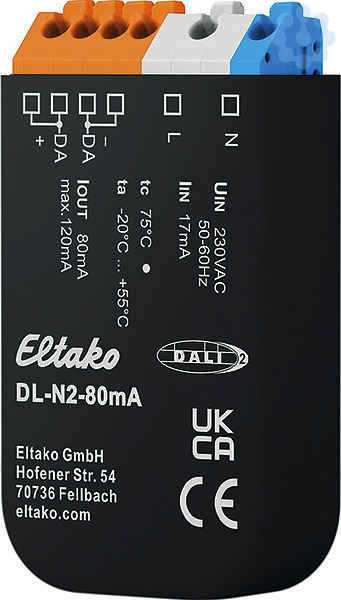 DALI-Bus-Netzteil mit 80mA Ausgangsstrom zur Versorgung von bis zu 40 Standard DALI-Geräten. 59x33x15mm. Geeignet für UP-Dose und Einbau in Schutzklasse II Geräte. Die Anschlussklemmen sind Steckklemmen für Leiterquerschnitte von 0,5mm² bis 1,5mm². Eingang: Versorgungsspannungsbereich 120V..240V AC/50-60Hz. Maximaler Eingangsstrom 10mA. Einschalt-Hochlaufzeit 250ms. Verlustleistung max. 2W. Ausgang: Ausgangsspannungsbereich 12V DC..20,5V DC. Ausgangsstrom 80mA. Leerlauffest und kurzschlussfest. Schutzart Gehäuse IP40. Schutzart Klemmen IP20. Impulsspannungskategorie II. Verschmutzungsgrad 2. Bemessungsisolationsspannung 250V. Bemessungsstoßspannung 4kV. Verstärkte Isolierung. Isolationsprüfspannung 3kV. Temperatur an der Einbaustelle -20°C bis +55°C. Lagertemperatur -20°C bis + 75°C. Relative Luftfeuchte 15% bis 90%.