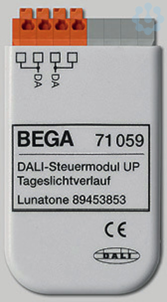 BEGA DALI-Tageslichtmodul 71059 für die tageszeit-abhängige Steuerung von Tunable-White-Leuchten. Modul für den Einbau in Schalter- und Hohlraumdosen. DALI Echtzeituhr. Automatische Sommer- / Winterzeitumschaltung einstellbar. Konfigurierbares Szenenverhalten. Interne Batterie für Uhrzeit. Anschlussklemmen 0,5-1,5 qmm. Stromversorgung über DALI-Bus, Stromaufnahme 5 mA. Abmessungen: 33 x 60 x 15 mm.