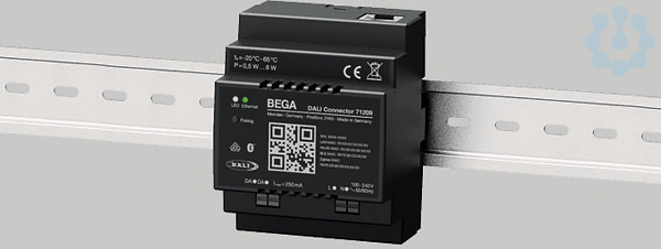 BEGA DALI Connector 71209 für die Inbetriebnahme und Steuerung von DALI-Betriebsgeräten und BEGA Steuerungskomponenten einer DALI-Linie via BEGA Connect. Modul für die Befestigung auf 35 mm-Hutschiene DIN EN 60715. Breite Reiheneinbaugerät (REG): 4 TE. Funkstandards: Bluetooth, WLAN. Integrierte Antenne. Anschlüsse: Ethernet und DALI. Der BEGA DALI Connector ist geeignet für die Steuerung und Visualisierung eines DALI-Systems bestehend aus maximal 64 DALI-Geräten. Versorgungsspannung: 100-240 V 50/60 Hz. DALI Out: Imax = 250 mA. DALI Spannung: U(DALI) = 16 VDC. Umgebungstemperatur: -20 °C bis 65 °C. Leerlaufleistung: 0,5 W / TBD.