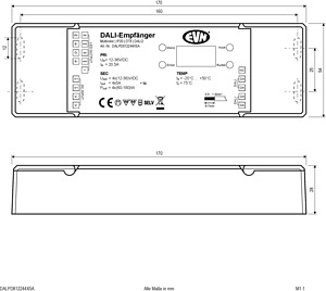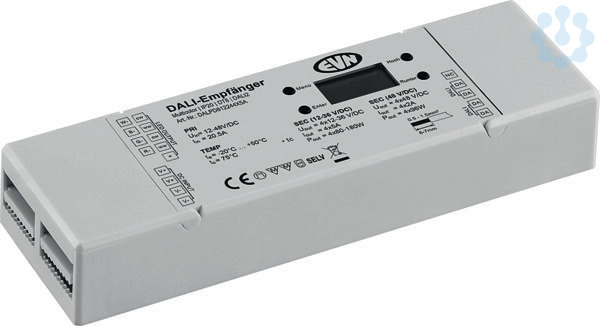 Der DALI-Multicolor-Empfänger kann für Unicolor-, Tunable-White-, RGB-, und RGBW-Leuchten verwendet werden. Dank des Protokolls DT8 wird für jede der vorgenannten Verwendungsmöglichkeiten nur eine DALI-Adresse belegt. Geeignet für LED-Leuchten mit 12, 24, 36 und 48V/DC Betriebsspannung. Die tatsächliche Eingangsspannung ist abhängig von der benötigten Spannung der zu versorgenden Leuchten. Anschlüsse: 1x Eingang, so wie 1x Ausgang für DALI-Bus für Durchgangsverdrahtung, 1x Eingang, so wie 1x Ausgang für 12-48V/DC für Spannungsversorgung zur Durchgangsverdrahtung und 4x Ausgang. Die Schraubklemmen sind für Kabel von 0,5mm² - 1,5mm² geeignet. Technische Daten: ta: -20°C - 50°C, tc: 75°C, max. Ausgangsleistung je Kanal: 5A bei 12-36V/DC, 2A bei 48V/DC (60W bei 12V/DC, 120W bei 24V/DC, 180W bei 36V/DC und 96W bei 48V/DC). Protokoll: DT8, DALI2.