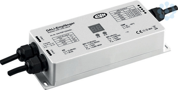 Der DALI-Multicolor-Empfänger kann für Unicolor-, Tunable-White-, RGB-, und RGBW-Leuchten verwendet werden. Aufgrund der gegebenen Schutzart kann der Controller auch im Außenbereich eingesetzt werden. Geeignet für LED-Leuchten mit 12-48V/DC Betriebsspannung. Die tatsächliche Eingangsspannung ist abhängig von der benötigten Spannung der zu versorgenden Leuchten. Anschlüsse: 1x Eingang für DALI-Bus (wahlweise Push-L), 1x Ausgang für DALI-Bus zur Durchgangsverdrahtung, 1x Eingang, so wie 1x Ausgang für 12-48V/DC für Spannungsversorgung zur Durchgangsverdrahtung und 4x Ausgang. Außerdem ist der Empfänger optional auch über Push-L (als 1-Kanal) dimmbar. Die Kabel haben primär- und sekundärseitig jeweils eine Länge von 40cm. Technische Daten: ta: -20°C - 50°C, tc: 75°C, max. Ausgangsleistung je Kanal: 5A bei 12-36V/DC, 2A bei 48V/DC (60W bei 12V/DC, 120W bei 24V/DC, 180W bei 36V/DC und 96W bei 48V/DC). Protokoll: DT6, DALI2.