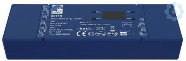 DALI-DT8-Dimmer, 4-Kanal-PWM-Ausgang, integrierte DALI-Master-Funktion Dank OLED-Display-Oberfläche ist eine einfache und schnelle Installation möglich Alle DT8-Farbtypen in einem Gerät: XY, Tc, RGBW Jedes Gerät wird über eine einzige DALI-Adresse angesteuert 16 Szenen können vorab am Gerät definiert und abgerufen werden 250 Hz - 30 kHz PWM-Frequenz einstellbar, sanfte und feine DT8-Farbsteuerung Am Gerät kann direkt ein Dimmwert und eine manuelle Farbkontrolle vorgenommen werden (Stand-Alone Funktion) Einschalt-, Dimm- und Fehlerverhalten direkt am Gerät einstellbar Kompatibel mit universellen DALI-Mastern, die DT8-Befehle unterstützen Entspricht der IEC 62386-209: 2011 Für die Innenanwendung, IP20 Gerätetyp: DT8 Schutzklasse III, CE, RoHS, REACH Temperaturbereich: -20°C bis +50°C Eingangsspannung 12V DC - 24V DC Ausgangsspannung: 12V DC - 24V DC (PWM) Leistung: 4 x 60W (12V), 4x 120W (24V) LxBxH in mm: 170 x 53,5 x 28,8