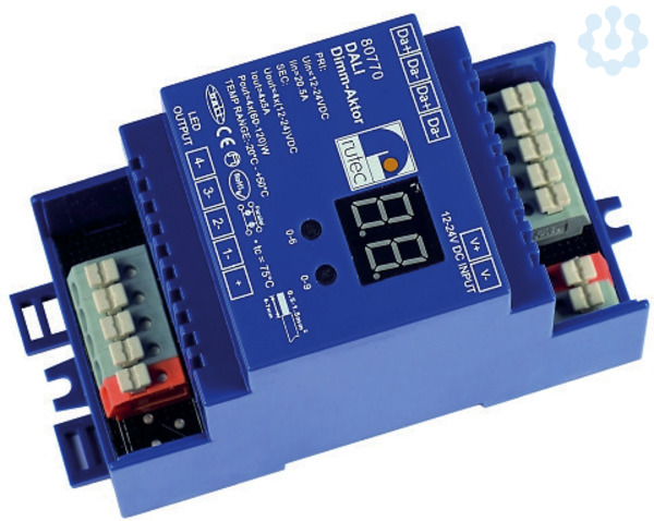 LED Dimmer für digitales dimmen mit weichem Regelverhalten 1 Adresse 4 Kanäle syncron DALI Adresse manuell einstellbar und sichtbar per Digitalanzeige Automatisch adressierbar vom Master Gemäß DALI Standard Protokoll IEC60929 IP20 Device Type: DT6 Dimmbereich 0,1-100% 256 weiche Graustufen Schutzklasse III CE ROHS REACH Schutz gegen Kurzschluss und Übertemperatur Input 12VDC-24VDC Output 12VDC-24VDC Leistung 4x60W(12VDC),4x120W(24VDC) LxBxH in mm: Temperaturbereich -20°C bis +50°C