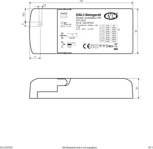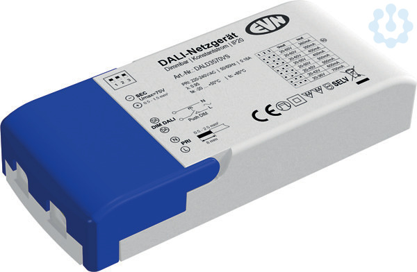 DALI-Dimmer-Empfänger mit integriertem Netzgerät für Unicolor-Leuchten mit automatischer DALI Adressen Einstellung. Ein Zusätzliches Betriebsgerät ist nicht erforderlich, da der Empfänger gleichzeitig als solches fungiert. Optional ist der Empfänger auch über Push-L (als 1-Kanal) dimmbar. Anschlüsse: 1x Eingang für DALI-Bus oder Push-L, 1x Eingang für 200-240V/AC und 180-250V/DC und 1x Ausgang für 260mA-700mA. Die Schraubklemmen sind für Kabel von 0,5mm² - 2,5mm² primär und von 0,5mm² - 1,5mm² sekundär geeignet. Technische Daten: ta: -20°C - 50°C, tc: 85°C, Powerfaktor: 0,95. Der zu verwendende Ausgangsstrom kann mittels Dipschalter eingestellt werden, hierbei sind folgende Einstellungen mit jeweiliger Leistung möglich: 260mA (5,2-15,6W), 350mA (7-21W), 400mA (8-24W), 450mA (9-24,8W), 500mA (10-25W), 550mA (11-24,8W), 600mA (12-25,2W), 700mA (14-25,2W). Protokoll: DT6, DALI2.