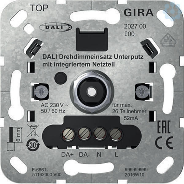 DALI Drehdimmeinsatz Unterputz mit integriertem Netzteil - Helligkeitseinstellung für Leuchten mit DALI Schnittstelle. - Einstellung der Farbtemperatur für Leuchten mit DALI Device Type 8 für Tunable White gemäß IEC 62386-209. - Drehbedienstelle (Input device) für übergeordnete DALI-2 Steuerungen. Produkteigenschaften ohne Programmierung: - DALI Drehdimmeinsatz Unterputz mit integriertem Netzteil für bis zu 26 DALI Teilnehmer. - Parallelschalten von bis zu 4 DALI Drehdimmeinsätze Unterputz mit integriertem Netzteil, mit der Möglichkeit bis zu 104 DALI Teilnehmer zu versorgen. - Multimasterfähig. - LED zur Gerätelokalisierung. - DALI Netzteil kurzschlussfest. - Speichern der Grundhelligkeit und einer Einschalthelligkeit. - Speichern von Farbtemperatur-Grenzwerten. Produkteigenschaften durch Programmierung über DALI-2 Steuerbefehle: - Geeignet als Drehbedienstelle (Input device) zur Anbindung an zentrale DALI-2 Steuerungen. - Unterstützt vier DALI-2 Instanzen zur Anpassung an zentrale Steuerung. - Kann zur Steuerung einer DALI-2 Gruppe genutzt werden. - Zyklisches Senden der Steuerbefehle an DALI Betriebsgeräte aktivierbar. Die Gerätefunktion ist konfigurationsabhängig