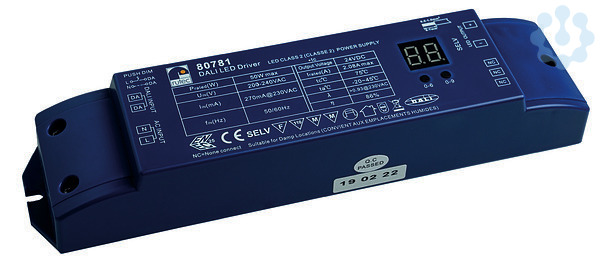 DALI + Push Dimm-Aktor AC 50W 1 Adresse 1 Kanal einfarbig für die Innenanwendung, IP20 DALI Adresse manuell einstellbar und sichtbar per Digitalanzeige Automatisch adressierbar vom Master Gemäß Dali Standard Protokoll IEC60929 Device Type: DT6 Schutzklasse II CE ROHS Dimmbereich 0,1-100% Eingangsspannung: 200-240 V AC Ausgangsspannung: 24 V DC Leistung: 50 W Temperaturbereich: -20°C bis +50°C LxBxH in mm: 210 x 50 x 32,5