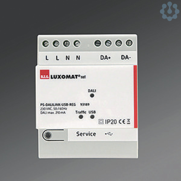 DALI Spannungsversorgung für Hutschienenmontage. 230VAC 50/60 Hz, Abmessungen 90 x 72 x 64 mm (4TE), Schutzart IP20, Nennstrom 210 mA. Max. 10 Multimaster-Sensoren oder Tasten-Module anschließbar. Systemströme beachten.