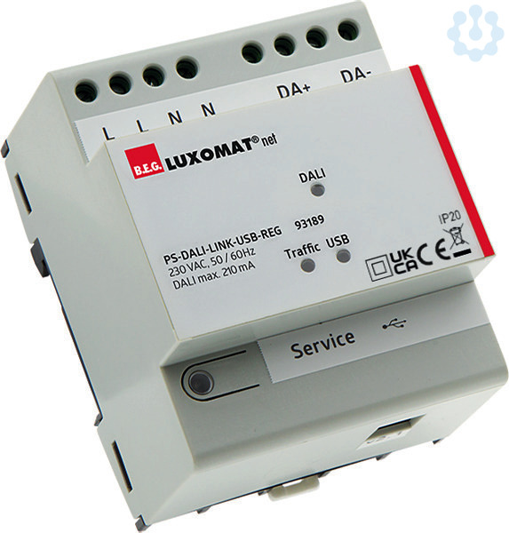 B.E.G. DALI-LINK Netzteil für die Hutschienenmontage, An die Spannungsversorgung können z.B. 45 DALI-Leuchten und 10 DALI-LINK Steuergeräte (Multisensoren oder Tasterschnittstellen) angeschlossen werden., Integrierte USB-Schnittstelle dient der Erweiterungsmöglichkeit auf die vernetzbare B.E.G. LUXOMAT(R)net DALI-SYS Lichtmanagement Lösung, Integrierte LEDs zur Visualisierung von Betriebsinformationen, Inbetriebnahme der B.E.G. LUXOMAT(R)net DALI-LINK Lösung erfolgt über eine kostenfreie App und das Tastermodul PBM-DALI-LINK-4W-BLE
