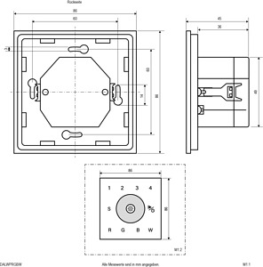 Mit dem DALI-Wandpanel können bis zu vier Kanäle angesteuert werden. Da es sich um ein RGBW-Wandpanel handelt, sind je Kanal vier DALI Adressen nötig. Die unterschiedlichen Farben können über das Touch-Wheel eingestellt werden, ebenso können die Farben Rot, Grün, Blau und Weiß aber auch einzeln zu- und abgeschaltet werden. Zusätzlich zu den zehn gespeicherten Farbwechsel-Programmen ist es möglich je Kanal bis zu vier Lichtszenen zu speichern. Natürlich ist auch das Dimmen mit dem Panel möglich. Da das Wandpanel als BUS-Geber fungiert ist der Einsatz der DALI Basisstation optional möglich, jedoch nicht zwingend nötig. Bei Betrieb als BUS-Geber (ohne DALI Basisstation) erfolgt der Anschluss an 230V, wobei maximal 50 Teilnehmer über ein Wandpanel gesteuert werden können. Außerdem können 3 weitere Wandpanel in das System mit eingebunden werden, welche über die BUS-Spannung des ersten Wandpanel (BUS-Geber) betrieben werden. Bei Betrieb mit der DALI Basisstation können max. 4 Wandpanel je Basisstation eingesetzt werden. Hierbei dürfen die Wandpanel nicht über 230V, sondern ausschließlich über die BUS-Spannung der DALI Basisstation betrieben werden. Darüber Hinaus besteht die Möglichkeit zwei Wandpanel über 230V in einem System zu betreiben, wobei nur eines der Wandpanel als BUS-Geber fungiert. Hierdurch können bis zu 100 Teilnehmer (50 je Panel) angesteuert werden. In dieses System können zwei zusätzliche Wandpanel über die BUS-Spannung mit eingebunden werden, wobei die steuerbare Teilnehmeranzahl unverändert bleibt. Die Montage ist ohne Probleme auf Schalterdosen möglich. Bitte beachten: Das Panel sendet einen Broadcast-Befehl, welcher alle Komponenten innerhalb eines BUS-Systems auf lineares Dimmen umstellt. Diese Funktion kann nicht abgeschaltet werden.