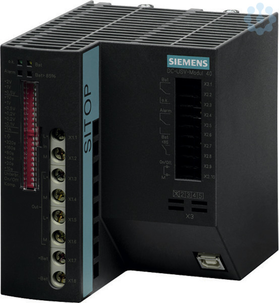 SITOP DC-USV-Modul 24 V/40 A Unterbrechungsfreie Stromversorgung ohne Schnittstelle Eingang: DC 24 V/43 A Ausgang: DC 24 V/40 A *EX-Zulassung nicht mehr verfügbar* Die unterbrechungsfreie Stromversorgung mit Batteriemodulen ist die optimale Ergänzung für alle 24-V-Stromversorgungen. Sie überbrückt längere Netzausfälle bis in den Stundenbereich und sorgt so für einen unterbrechungsfreien Anlagenbetrieb. Auch wenn ein größerer Pufferstrom benötigt wird, bietet die DC-USV mit wartungsfreien Blei-Akkus optimale Sicherheit.