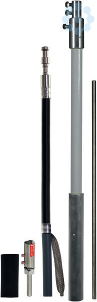 DEHNcon-H HVI light Leitung (Hochspannungsfeste isolierte Ableitung) im Stützrohr, zum Einhalten des Trennungsabstandes zu elektrisch leitenden Teilen nach DIN EN 62305-3 (VDE 0185-305-3), um gefährliche Überschläge zwischen Teilen des Äußeren Blitzschutzes und inneren, leitfähigen Teilen (Elektroanlage, Rohrleitungen, usw.) zu verhindern. Um Gleitentladungen zu vermeiden, ist die HVI Leitung mit einem äußeren Spezialmantel ausgestattet, der es ermöglicht, hohe Blitz-Impulsspannungen gegen ein Bezugspotential ab zusteuern. Ausführung DEHNcon-H HVI light Leitung (grau), mit innenliegendem Endverschluss im Stützrohr (Länge 2640 mm) mit Fangspitze (D10 mm Länge 1000 mm) und einem Erdanschlusselement. Äquivalenter Trennungsabstand s ≤ 45 cm (in Luft), s ≤ 90 cm (fester Baustoff).