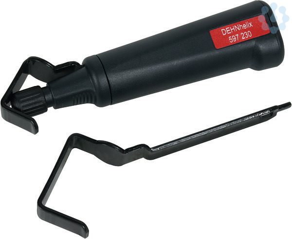 DEHNhelix Werkzeug zum Abmanteln des zusätzlichen grauen Mantels der HVI light Leitung und HVI Leitung mit einem Außendurchmesser von 20 mm bzw 23 mm. DEHNhelix besteht aus einem Handgriff und zusätzlich wechselbarem Bügel (je nach Durchmesser der Leitung).