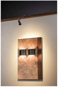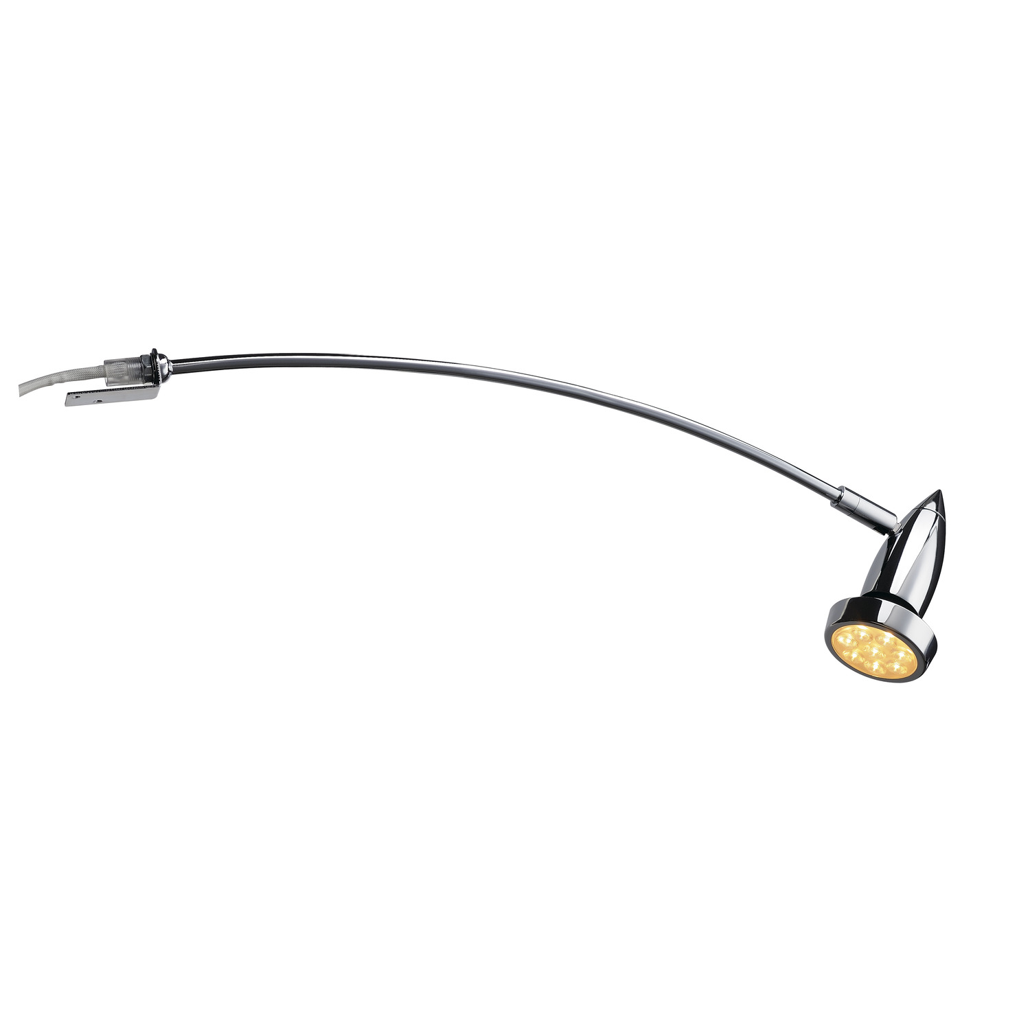 Dreh- und schwenkbare Hochvolt-Displayleuchte DISPLAY bei der Montagebügel und Kopf über einen gebogenen Ausleger verbunden sind. Durch den montierten GU10 Sockel ist die individuell mit LED- oder Halogenleuchtmittel bestückbare Leuchte für viele Anwendungen geeignet. Der elektrische Anschluss der Leuchte erfolgt durch die Zuleitung sowie Anschlussbox direkt an 230V Netzspannung.