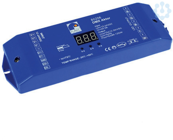 DMX Aktor DC DMX512 3 ,4 oder 5 Kanäle 1-5 Adressen einstellbar max. 5A pro Kanal DMX Adresse frei einstellbar und sichtbar per Digitalanzeige Stand-Alone-Modus verfügbar für die Innenanwendung IP20 Schutzklasse III,CE,RoHS,REACH Input:12V DC-24V DC Output:12V DC-24V DC Leistung: 12V 60W pro Kanal/24V 120W pro Kanal Abmessung:178x57,1x21mm Temperaturbereich: -20°C bis +50°C