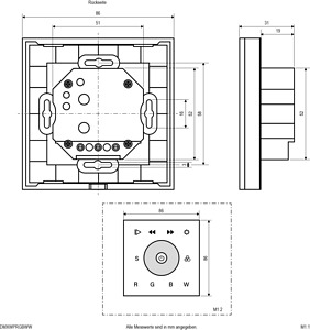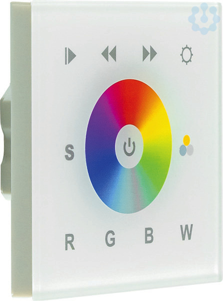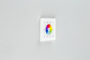DMX-Wandpanel für die Ansteuerung der DMX-Controller. Für Schalterdosenmontage geeignet. Funktionen: Farbwechsel über Touch-Farbrad, Direktfarbwahl (rot, grün, blau und weiß), Ein- und ausschalten, so wie Programmwechsel. Passend für DMX-C4x5A, DMX-C350MA und DMX-C700MA.